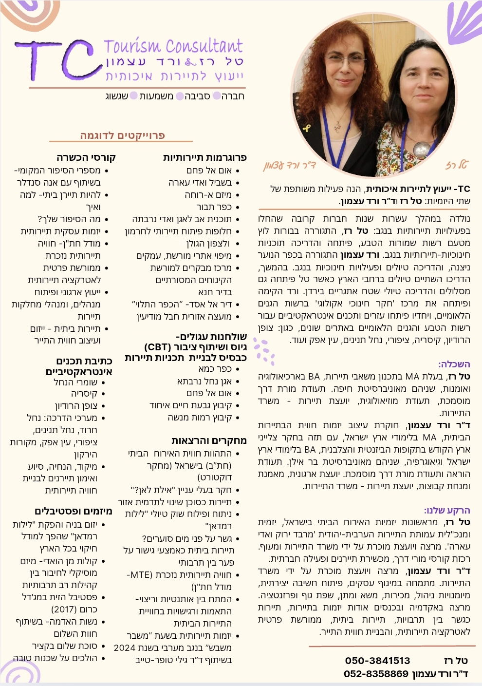 טל רז, מ'יוזמות תיירות חברתית'/'תכשיט של טיול' ואנוכי, שילבנו ידע רב שנים, ניסיון מגוון, וכוחות חדשים, והקמנו את TC-Tourism Consultant, ייעוץ לתיירות איכותית.